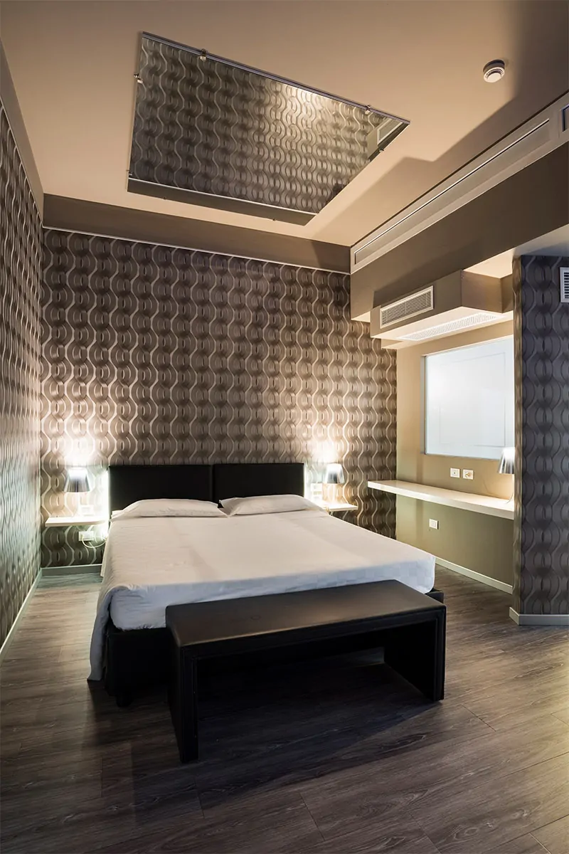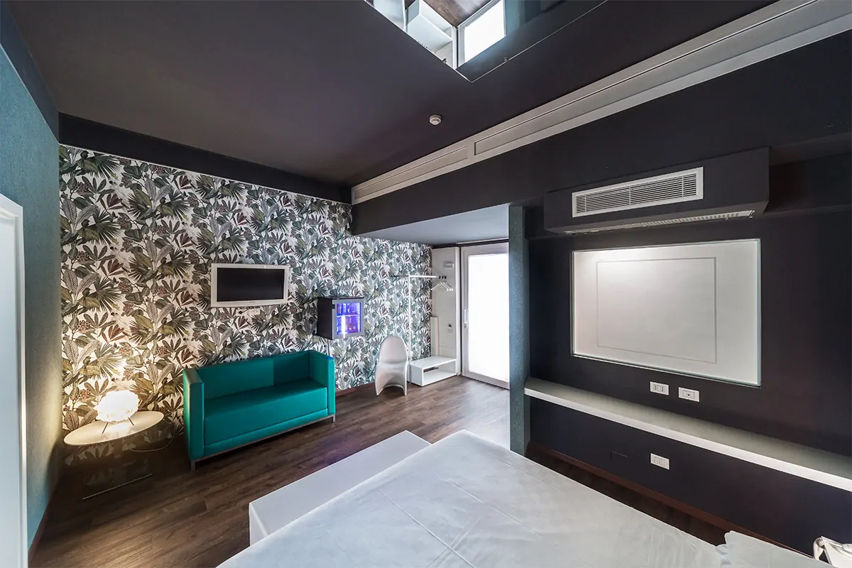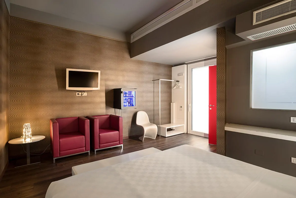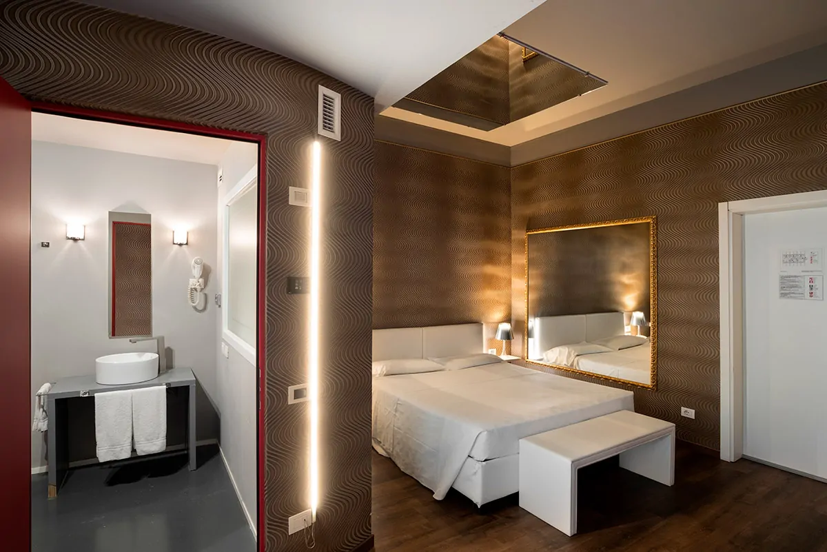 Le camere sono dotate di ingresso con salottino e bagno con ampia doccia. La ambientazioni sono un mix perfetto tra modernità ed eleganza con tocchi di oro, argento, nero o rosso rubino. Il parcheggio di fronte alla camera è riservato e indipendente. Un pannello scorrevole scenderà a coprire l'autovettura garantendo assoluta privacy.